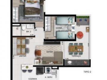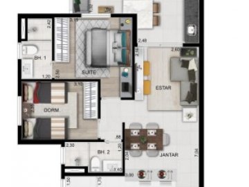 Apartamentos de 65m² com 2 dormitórios, sendo 1 suíte.